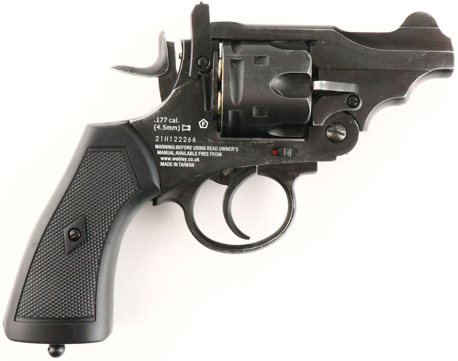 Webley MK VI BB Gun, CAL: .177 (4.5mm), SN: 21H122266. has 3 of 6 faux cartridges. Grade: Good ++ - Value: 50 to 150