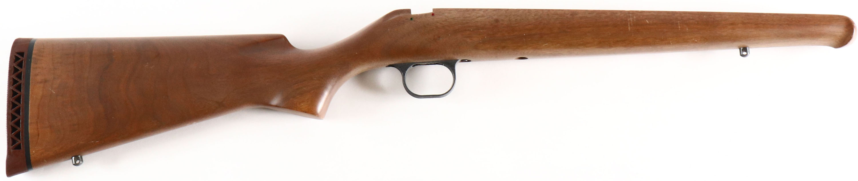 Knight MK-85 Take-off stock. Flat pistol grip, Sling studs, trigger guard, Knight MK-85 marked ventilated kickpad, factory finish. Nice rippled grain. Overall condition is excellent, with several minor chatter marks & light contusions to the finish on the left side. - Value: 10 to 100