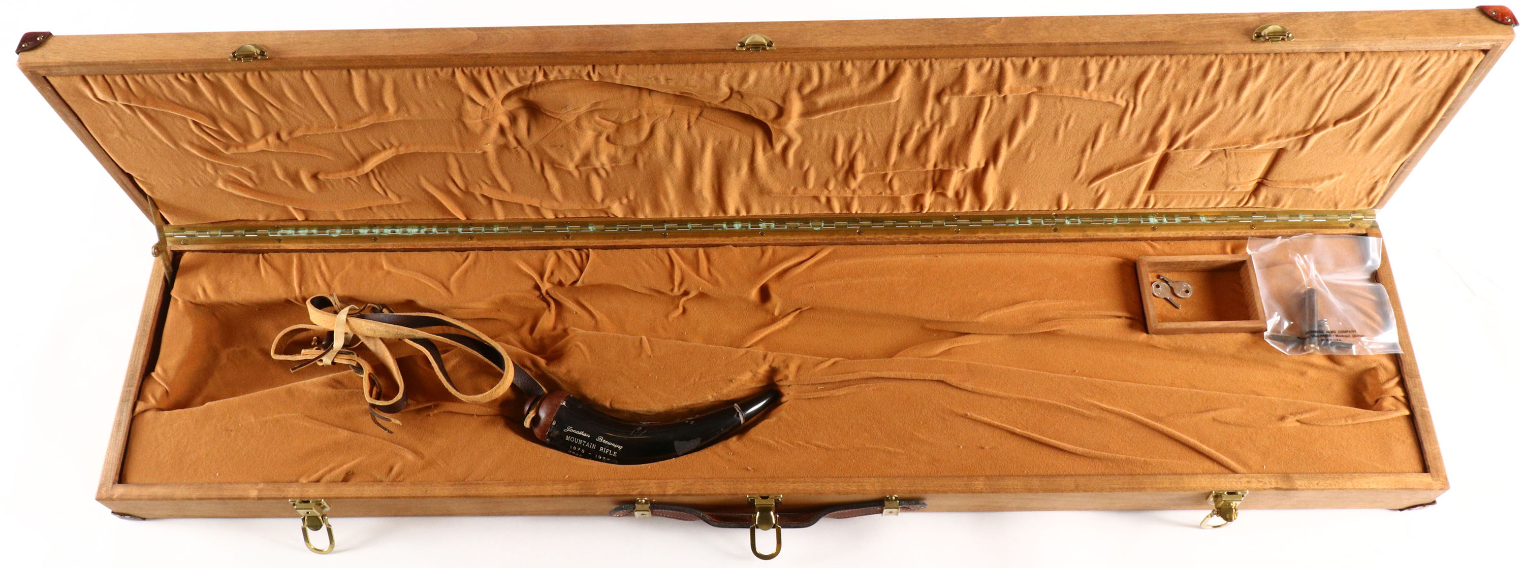 Boxed Original Browning Jonathan Browning Moutain Rifle wood display case. Comes with correct powder horn engraved with ''Browning Jonathan Browning Moutain Rifle, 1878-1978, #0086 of 1000, on the side of it. Comes with a couple of additional parts & key for the case. Grade: Excellent - Value: 20 to 200