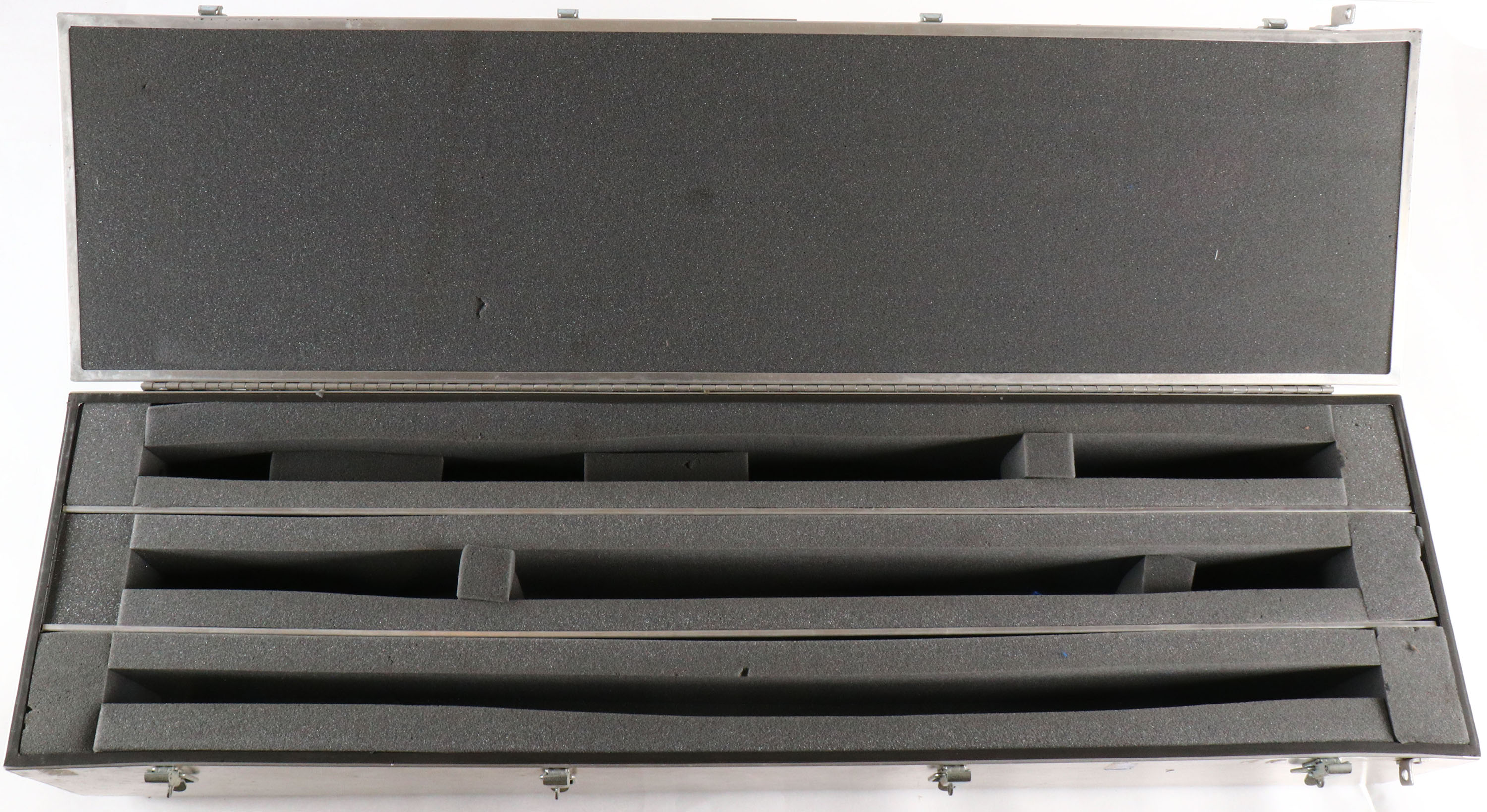 Cabela's, Aluminum rolling & locking gun case, holds up to 6 long guns, (3) aluminum dividers, has handles at top and end, wheels on end, 1/4'' security bar, all (4) latches have provisions for padlocks, inside is minty, OD: 52'' x 14'' x 10 3/4''. Grade: Excellent - Value: 40 to 200