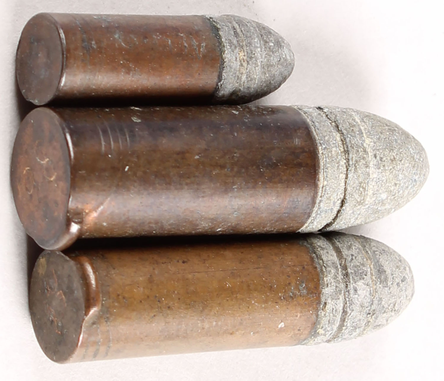 Lot of 3. Lipfire Cartridges in calibers: .25, .32 and .36 . NHS. Copper cases. - Value: 30 to 50