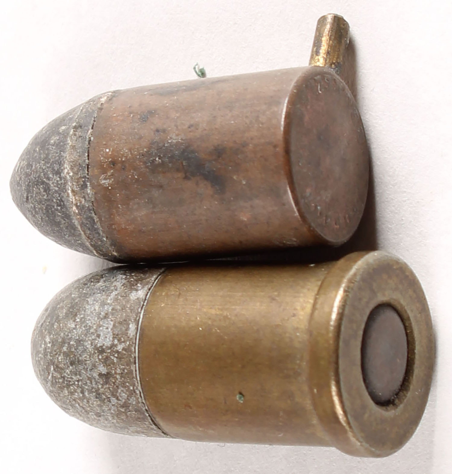 Lot of 2. (1) 12mm Pinfire. HS:''FUSNOT * BRUXELLES *'', PT Lead, Copper Case. (1) 12mm Perrin (Thick Rim), NHS, RN Lead, brass Case. Grade: Very Good ++ - Value: 20 to 40