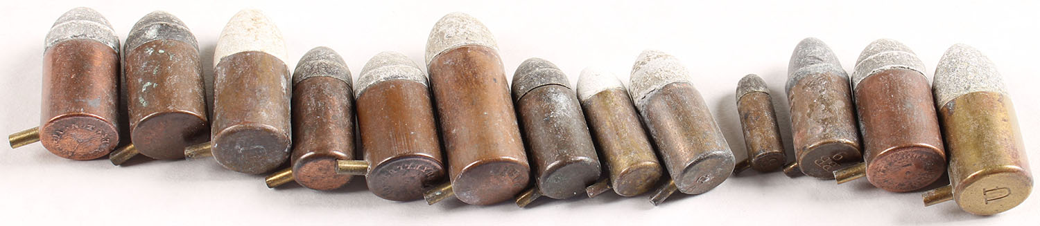 Lot of 13. Pinfire revolver cartridges. (7) 12mm Pinfires, five with copper cases and one brass case. Headstamps are mostly hard to read. (4) 9mm Pinfire cartridges with copper cases. (1) 7mm pinfire with copper case. (1) 5mm Pinfire with copper case. See Photo. Grade: Excellent - Value: 40 to 80