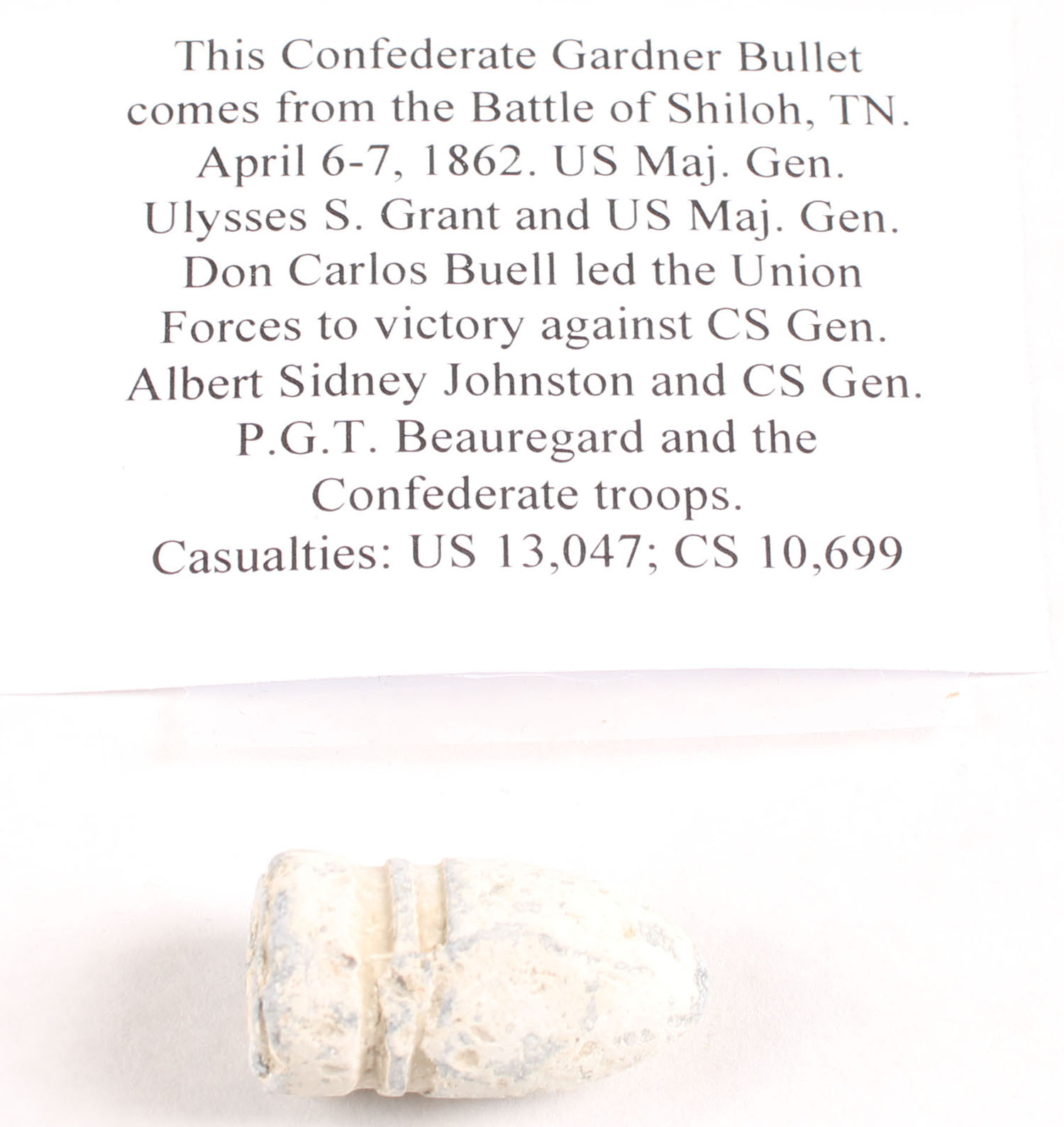 This Confederate Gardner Bullet comes from the Battle of Shiloh, TN. April 6-7, 1862. US Maj. Gen. Ulysses S. Grant and US Maj. Gen. Don Carlos Buell led the Union Forces to victory against CS Gen. Albert Sidney Johnston and CS Gen. P.G.T. Beauregard and the Confederate troops. Casualties: US 13,047; CS 10,699. Grade: Excellent - Value: 10 to 200