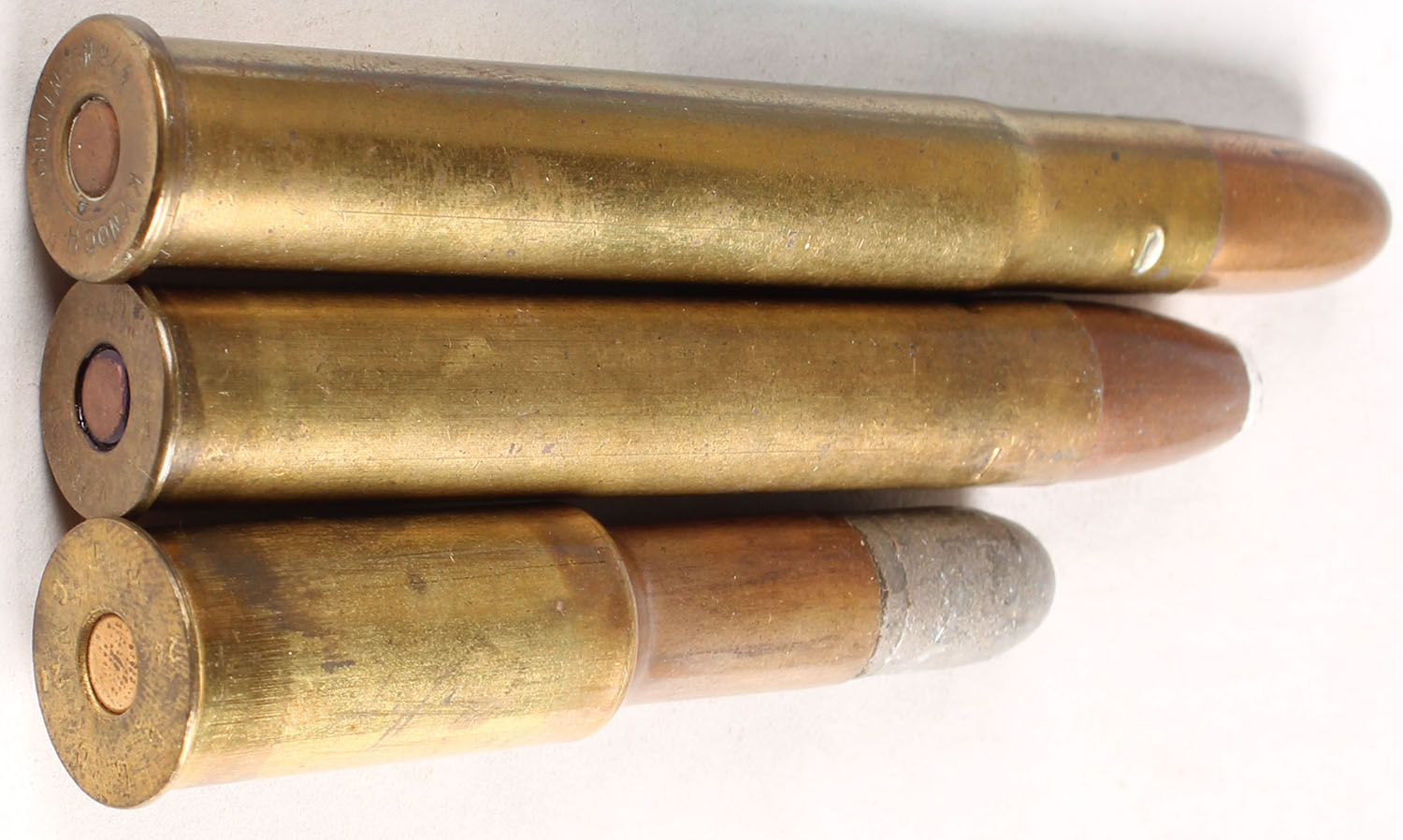 Lot of 3. (1) .500 Nitro, HS:''KYNOCH .500 NITRO'', RN CJ SP.(1) 475#2 Nitro, HS:''KYNOCH 475 No 2 NITRO'', RN CJ FMJ. (1) 577/450 Martini, HS:''CBC 24 CBC 24'', RN Lead, Uses 24 gauge brass shell. - Value: 30 to 60