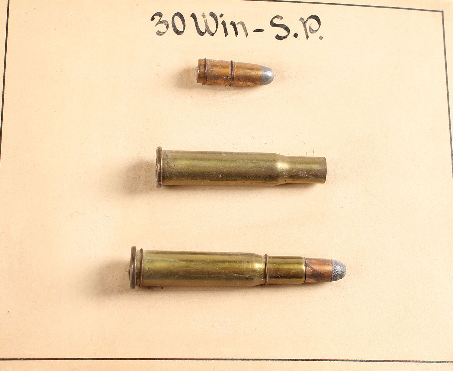 Winchester Exposition Display Board. 30-30 Winchester. Hard fiberboard with an empty cartridge, a projectile and a dummy loaded round. These boards were displayed by Winchester at various Sportsman's Shows in the early 1900's to show the public their line of ammunition. This board is believed to have been displayed circa 1914. - Value: 10 to 150