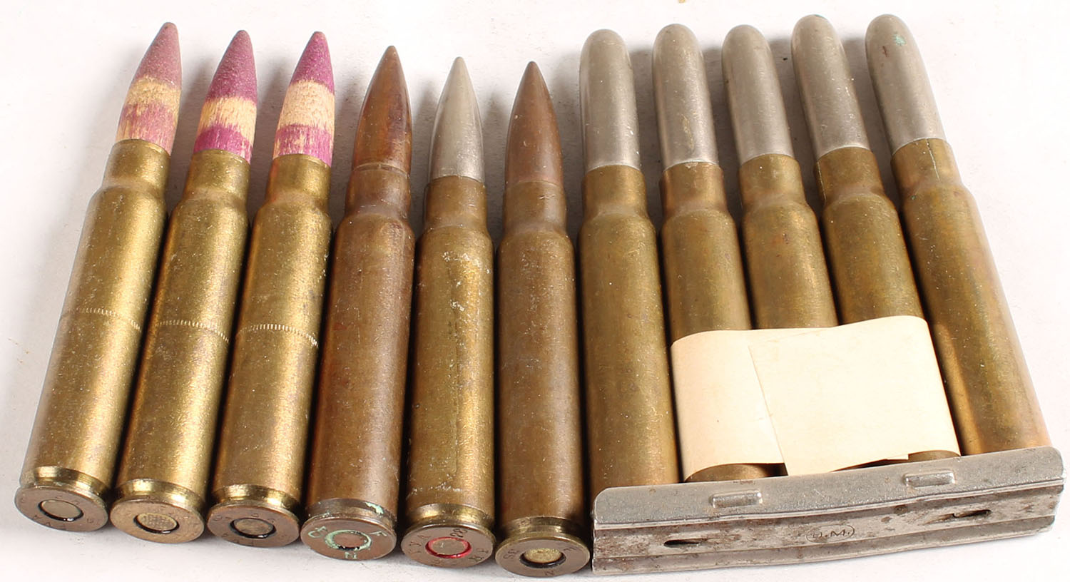 Lot of 11. 7.65x54mm Mauser. All military. (5) HS:''DM 95 * K * 18'', RN CN FMJ, in charger. (3) Argentine wood blanks w/ purple tip. (3) Military loadings with 2 by FN and one by Hirtenberg. Grade: Very Good ++ - Value: 10 to 20