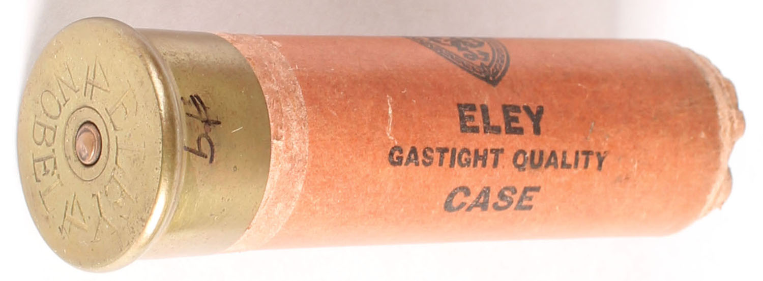 ELEY NOBEL, 4 ga, 3 3/4'' OAL. Fired empty, red paper case. Grade: Excellent - Value: 20 to 80