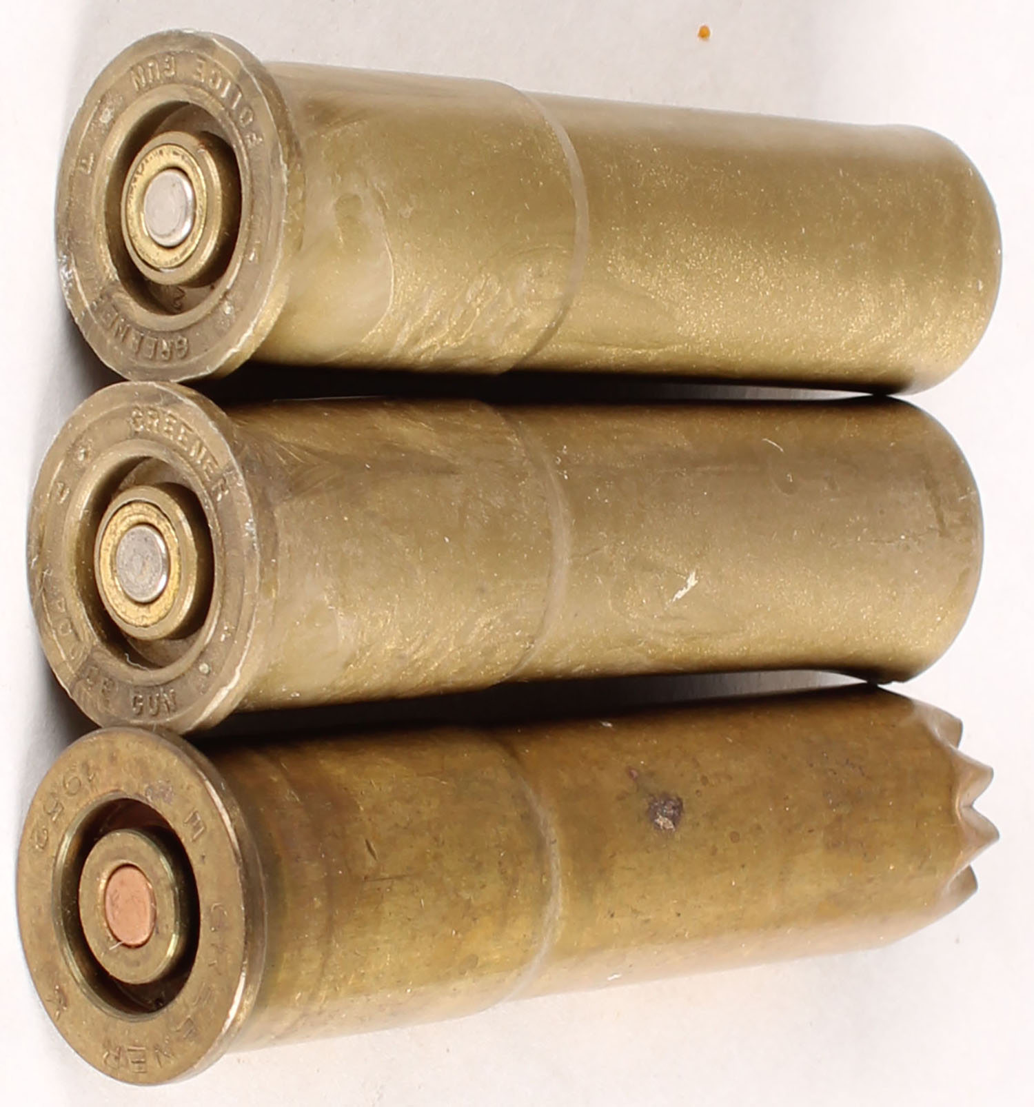 Lot of 3. Mark III Special Greener Police Gun. (2) Plastic case, HS:''GREENER F POLICE GUN V''. (1) Brass Case, HS:''GREENER K 1952 E''. Grade: Excellent - Value: 10 to 20