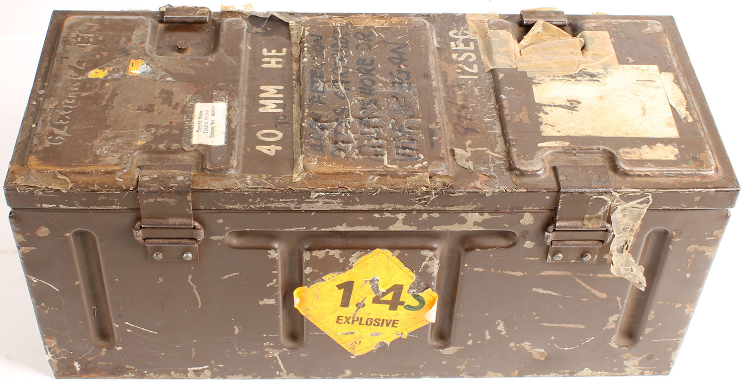British, 40mm shell canister for 9 shells, empty, inside has spots of rust forming. Grade: Very Good + - Value: 10 to 30