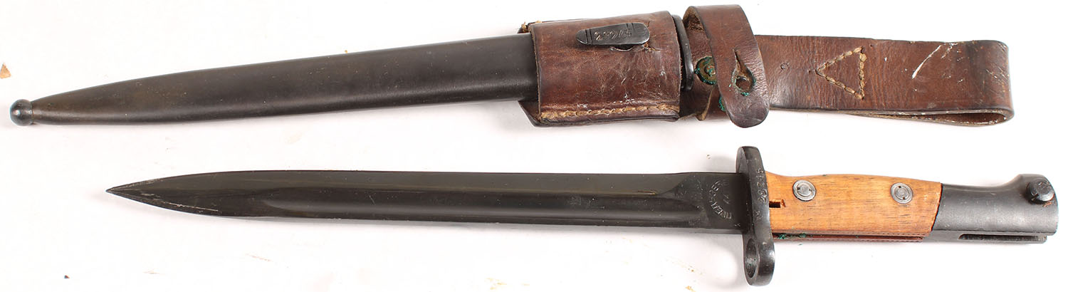 Yugo, Factory 44, Zavodi Crvena Zastava (Red Flag Works), M1948 Bayonet with sheath & frog. The blued blade has minor sheath wear at the tip. The right side of the blade is marked ''PREDUZECE'' in Cyrillic, over ''44''. The right of the guard is marked ''29245''. The left side of the guard is marked with more proofs. Grade: Excellent ++ - Value: 40 to 80