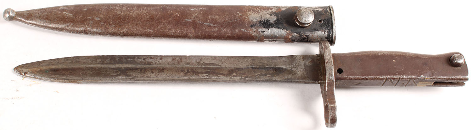 Turkish, German Ersatz Bayonet & sheath. Bare metal blade with a few spots of patina. The backstrap of the handle is marked with a large ''VN''. The sheath has finish wear & spots of brown patina. Grade: Very Good + - Value: 30 to 60