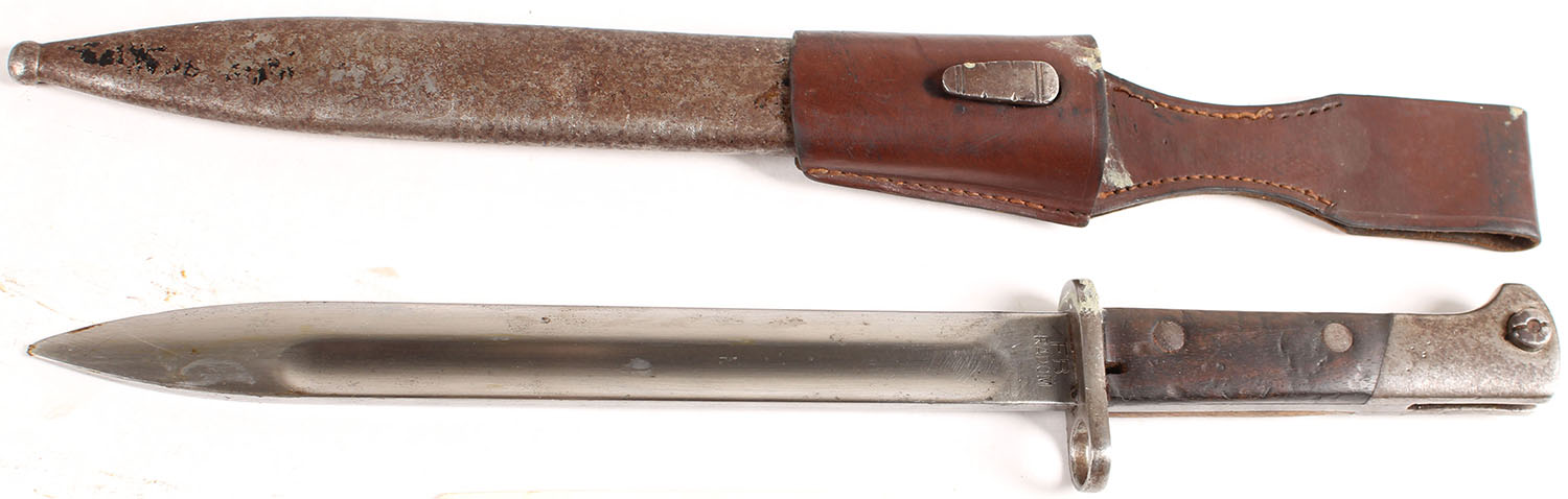 RARE!!!, Polish, FB Radom, WZ.29 Bayonet with sheath & frog. The guard has rust pitting & patina, the pommel has patina. The left side of the blade is marked with a lined out ''W.P.'', ''T W'', ''1'' Polish crowned eagle ''48''. The right side of the blade is marked ''F.B.'', ''RADOM''. The leather frog & bayonet have some type of gray reside on them. Grade: Very Good ++ - Value: 200 to 600