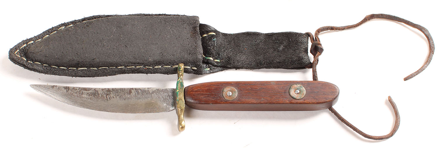 WW2 theater made knife with leather/wood sheath, Made from file, brass guard & wood handle, leather wrapped wood sheath. Grade: Very Good ++ - Value: 8 to 60