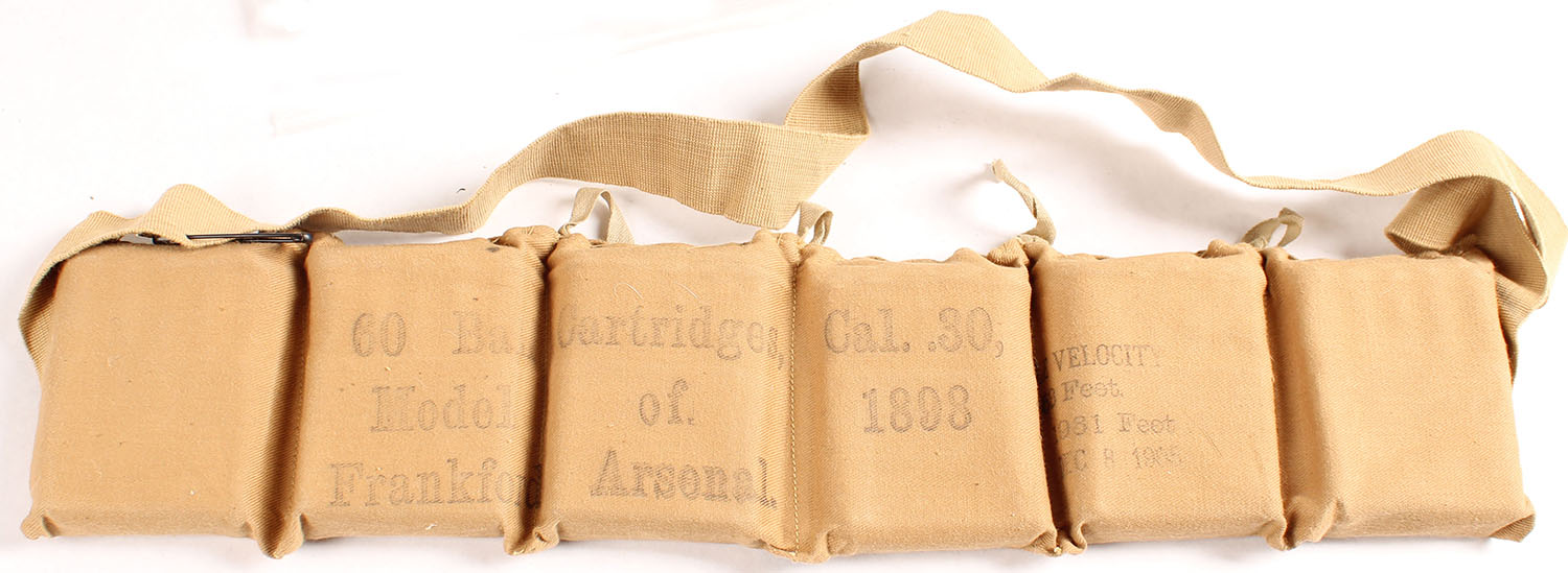 US, Frankford Arsenal, 6 pouch Bandoleer, .30-40 Krag, 60 Rds. total, all pouches are still sown shut with pull tabs. The front of the bandoleer is marked ''60 Ball Cartridges Cal..30,'', ''Model of 1898'', ''Frankford Arsenal.'', ''RIFLE VELOCITY'', ''At 53 Ft.'', ''1961 Feet'', ''DEC 8 1905''. Grade: Excellent - Value: 50 to 150