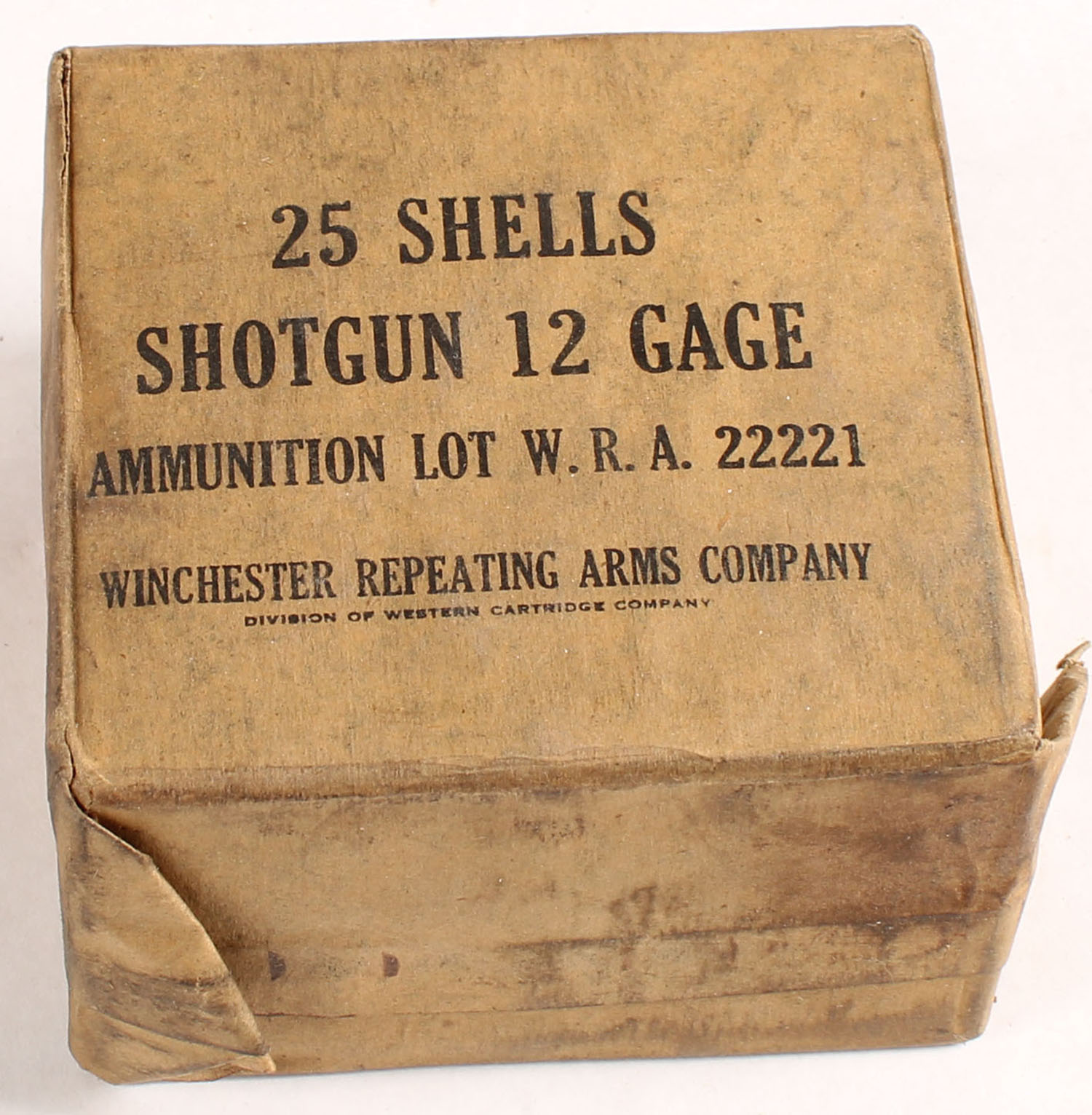 Winchester, 12 Gauge, Lot W.R.A. 22221, foil wrap, SEALED, brown wrap with black print, the foil wrap has rub marks & age soiling. Grade: Excellent - Value: 30 to 90