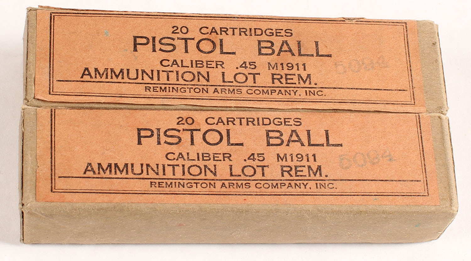 Lot of two, Remington, .45 M1911 pistol ball, both lot REM 5094, 1pc, both FULL & SEALED, brown box with red label & black print, boxes have pen marks & light wear. Grade: Excellent - Value: 20 to 40
