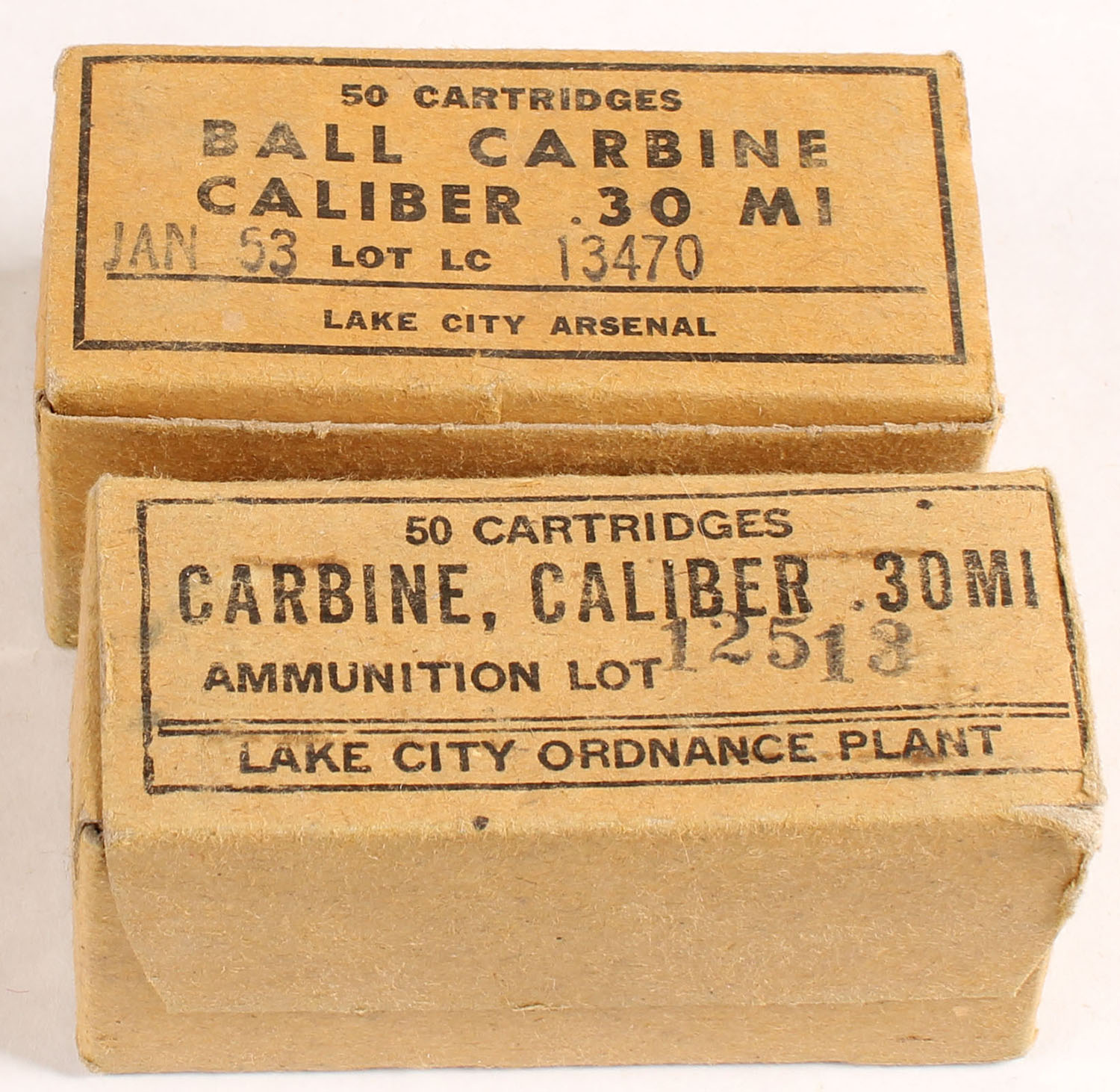 Lot of two, Lake City, .30 carbine M1 Ball, 1pc, both Full, one is SEALED. brown boxes with black print, boxes have stains & wear, ammo is very good. Grade: Excellent - Value: 40 to 80