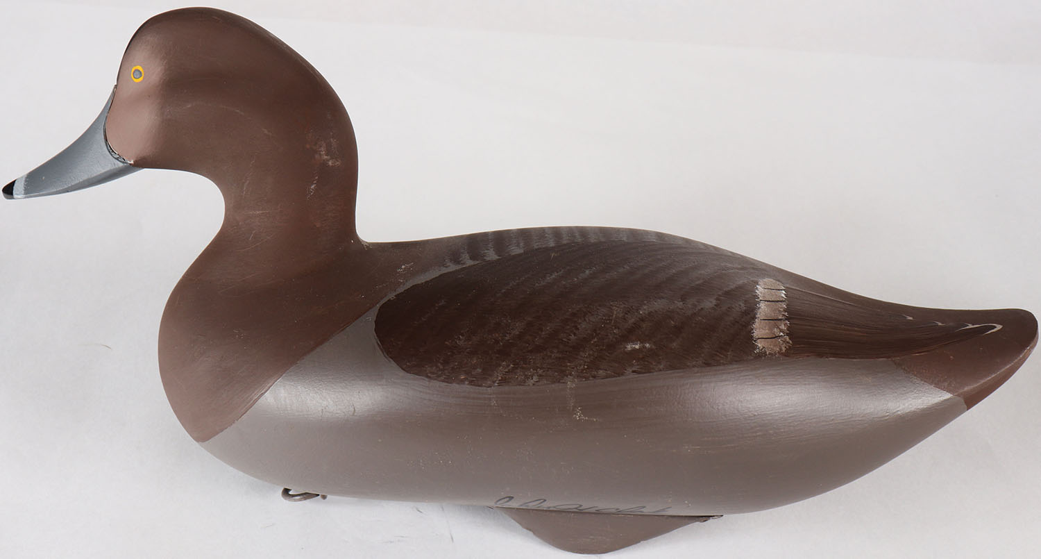 Ringbill Hen by John H. Clark, Havre De Grace, MD, painted eyes, solid wood, original paint, structurally excellent, signed on bottom, 14 1/2'' OAL. Grade: Excellent + - Value: 20 to 40