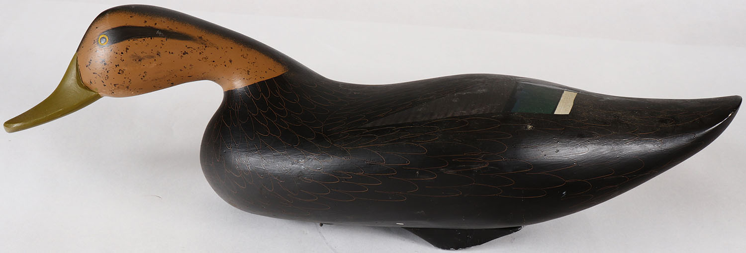 Swimming Black Duck by Patrick ''Pat'' Vincent, Churchville, MD, painted eyes, solid wood, original paint, structurally excellent, signed on bottom, 19'' OAL. Grade: Excellent ++ - Value: 50 to 100