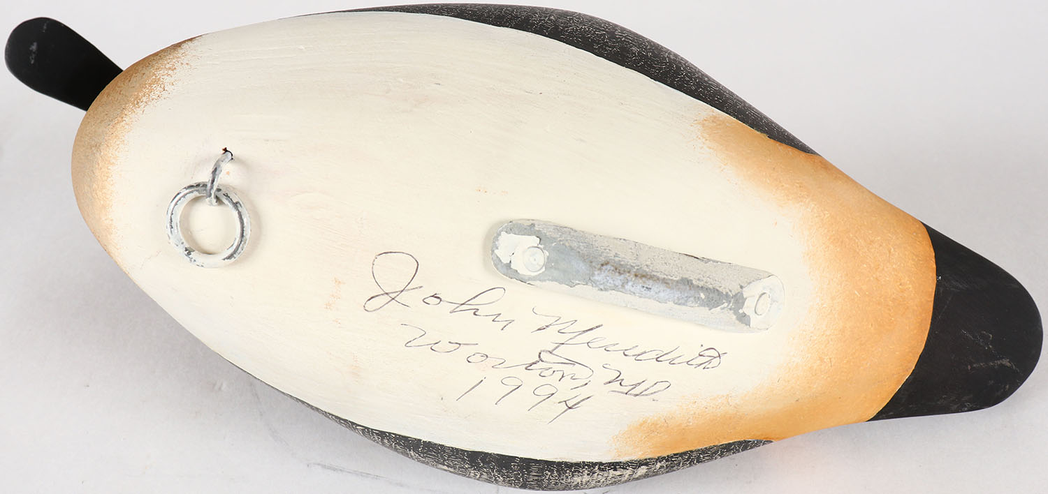 Greenwing Teal Drake on wood stand by John Meredith, Worton, MD. Glass eyes, solid wood, original paint, structurally excellent, 11 3/4'' OAL. Grade: MINT - Value: 50 to 100