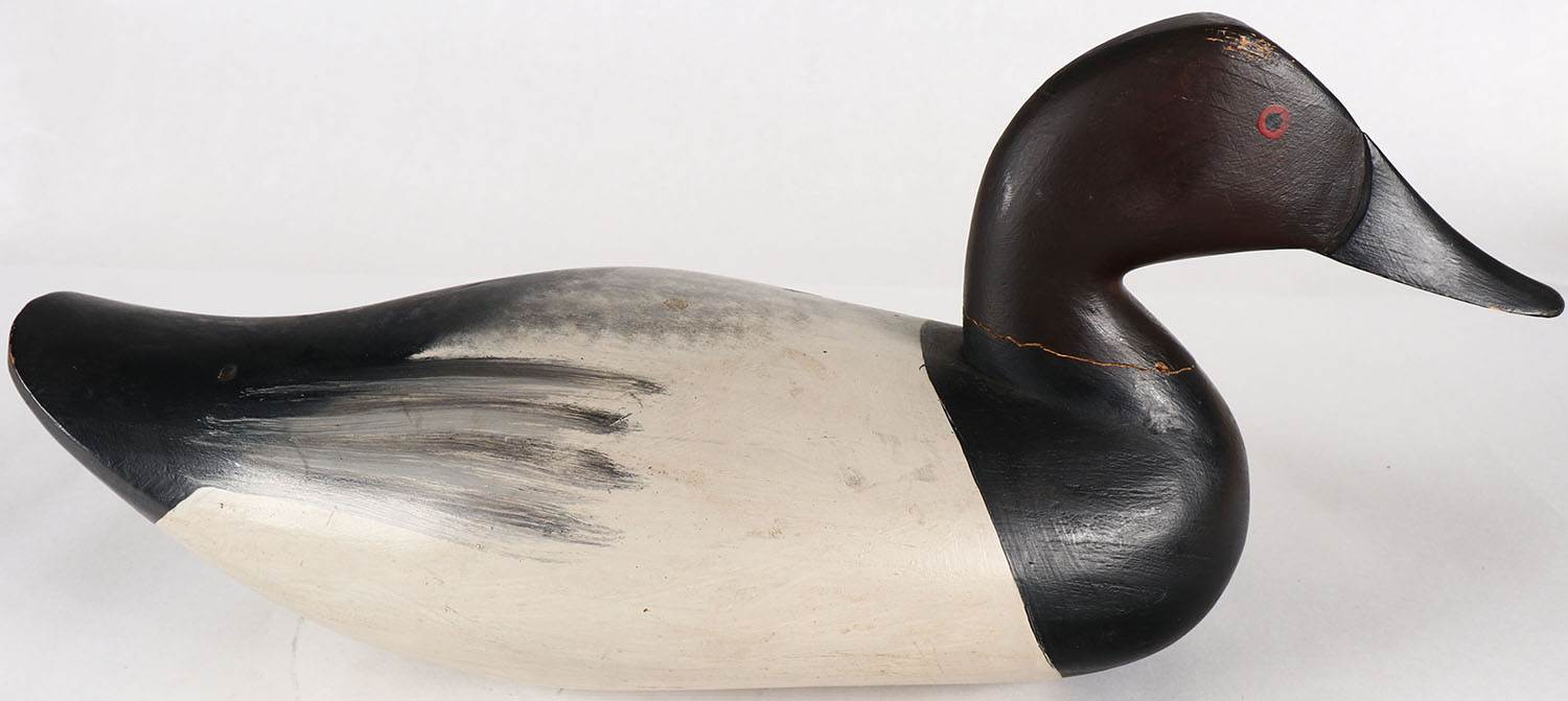 Canvasback Drake by Unknown MD carver, painted eyes, solid wood, original paint, structurally excellent except for hair line crack at neck, 16'' OAL. Grade: Excellent - Value: 30 to 60