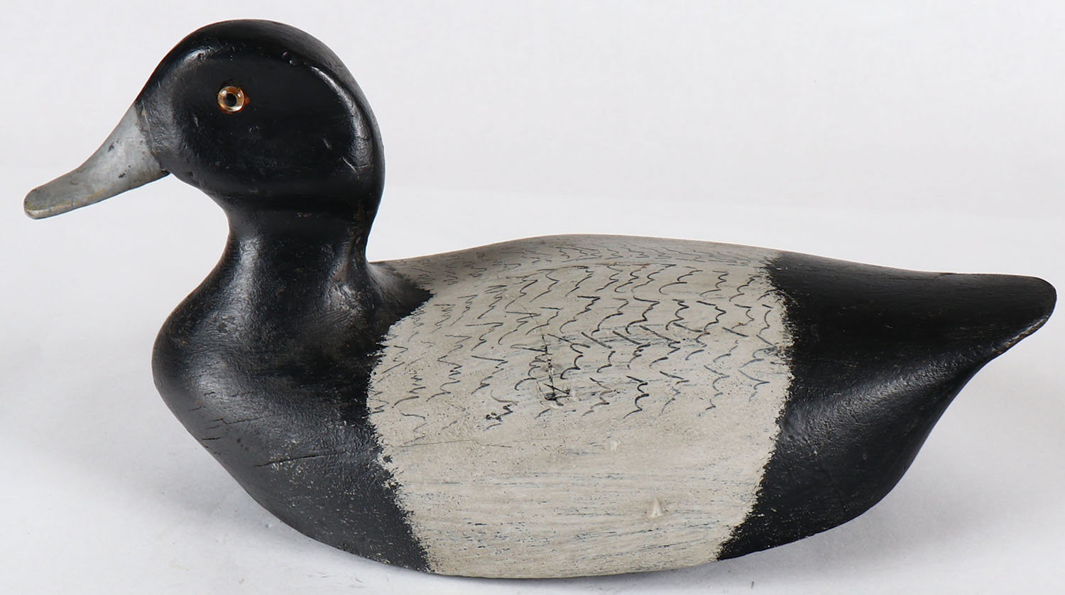 Bluebill Drake decoy by unknown carver, PE, solid wood, old repaint with crack repair to head, 13'' OAL. Grade: Very Good - Value: 20 to 40