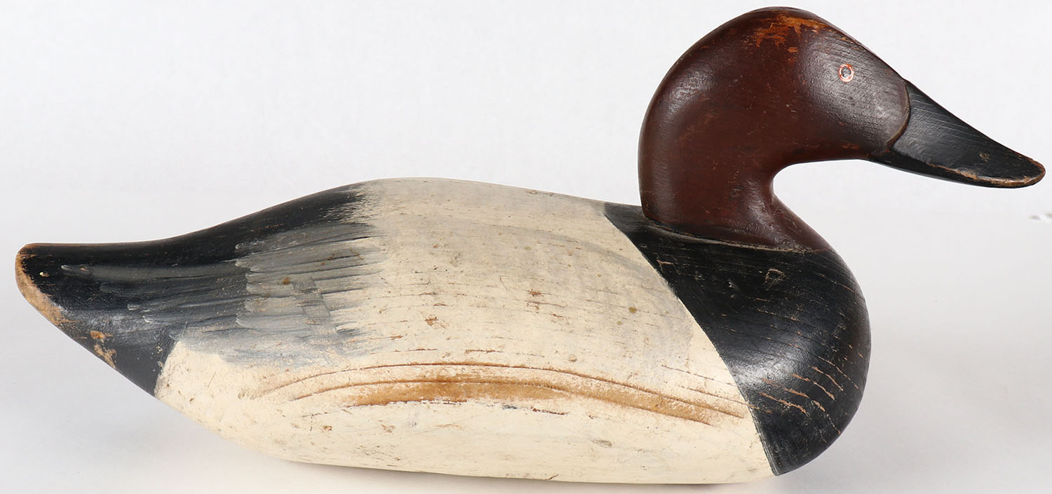 Canvasback Drake by unknown carver MD, possibly an earlier Madison Mitchell, PE, solid wood, original paint, weight missing structurally excellent, 15''. Grade: Excellent - Value: 40 to 80