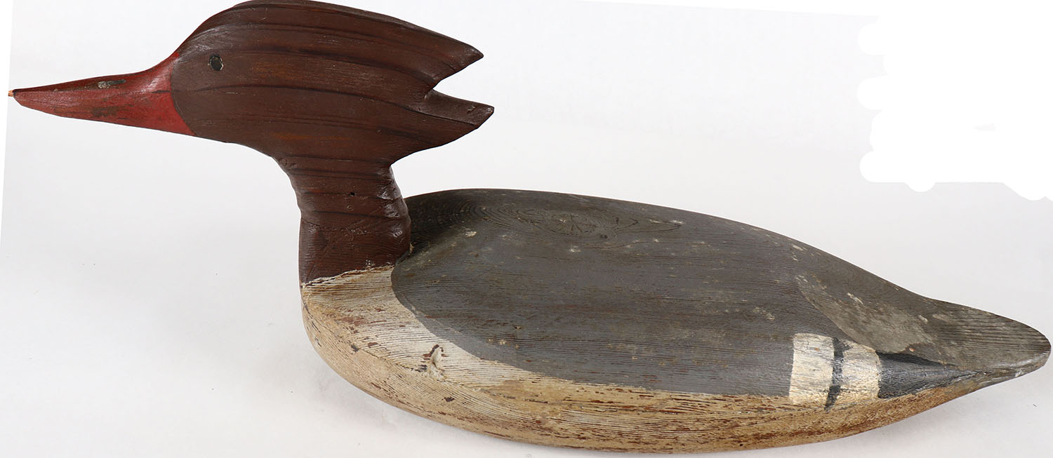 Hooded Merganser by unknown carver, TE, solid wood, nice original paint, has repaired neck. Grade: Very Good - Value: 10 to 30