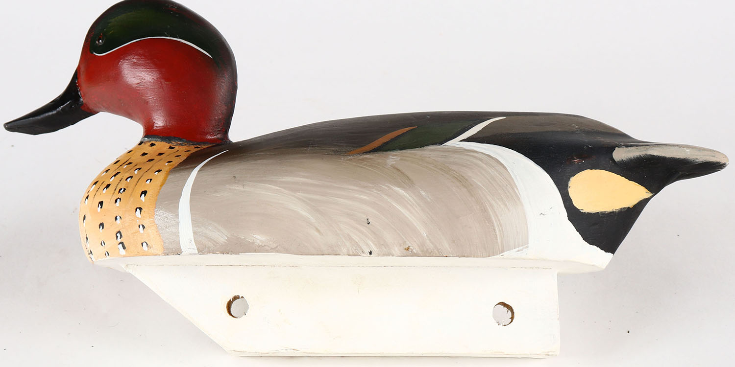 Greenwing Teal Drake by Bill William Goenne, King City, CA, glass eyes, hollow wood, original paint, structurally excellent, branded WRG on bottom. Grade: Excellent + - Value: 100 to 200