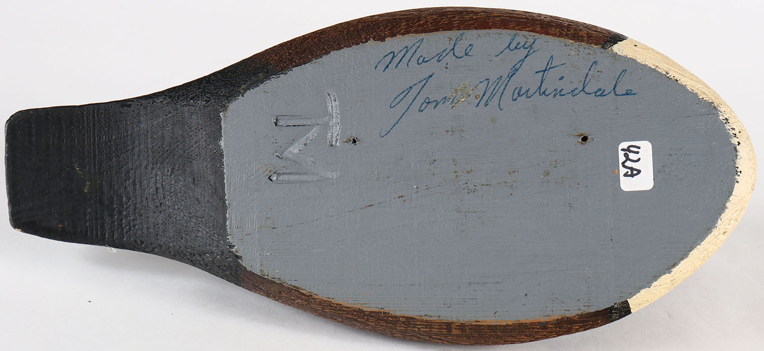 Hooded Merganser Drake by Tom Martindale, Ontario, Canada, glass eyes, solid wood, original paint, structurally excellent, branded TM on bottom. Grade: Excellent ++ - Value: 20 to 50