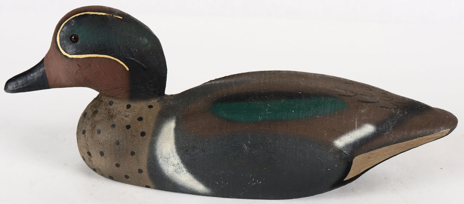 Greenwing Teal Drake by Herters Decoy Co., Waseca, MN, 1893 series, glass eyes, solid wood, original paint, structurally excellent, marked on bottom. Grade: Excellent ++ - Value: 50 to 100
