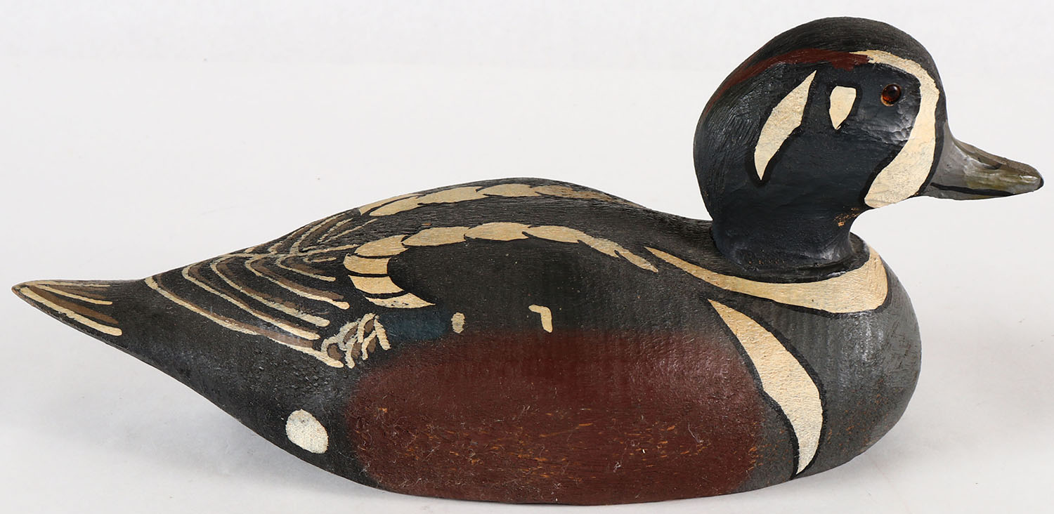 Harlequin Drake by Herters Decoy Co., Waseca, MN, 1893 series, glass eyes, solid wood, original paint, structurally excellent, unmarked on bottom. Grade: Excellent ++ - Value: 40 to 100
