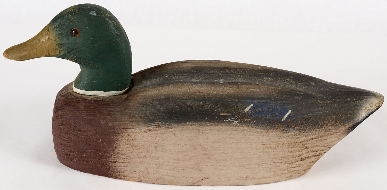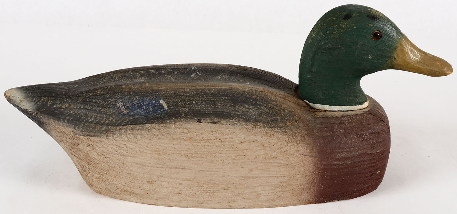 Mallard Drake by Herters Decoy Co., Waseca, MN, 1893 series, glass eyes, solid wood, original paint, structurally excellent, unmarked on bottom. Grade: Excellent ++ - Value: 40 to 100