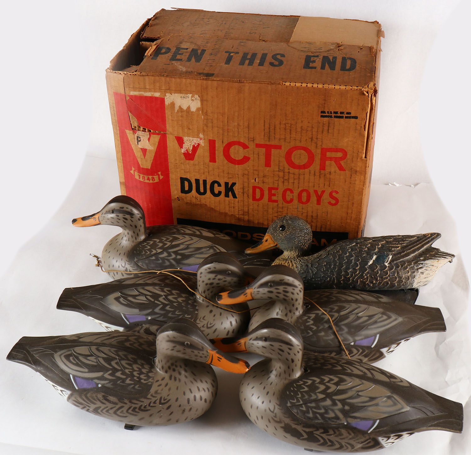 Full Case of 6 Mallard Hens by Victor Animal Trap Co. Lititz, PA, in the original box, one hen is of a different MFG., rare to find the original box. Grade: MINT - Value: 60 to 200