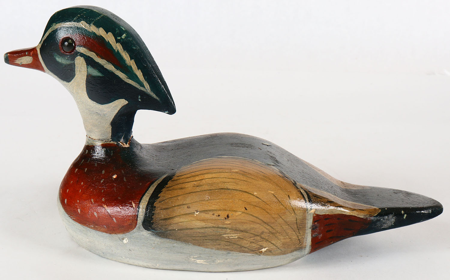 Woodduck Drake by unknown carver, GE, solid wood, original paint, has neck crack. Grade: Very Good + - Value: 20 to 40