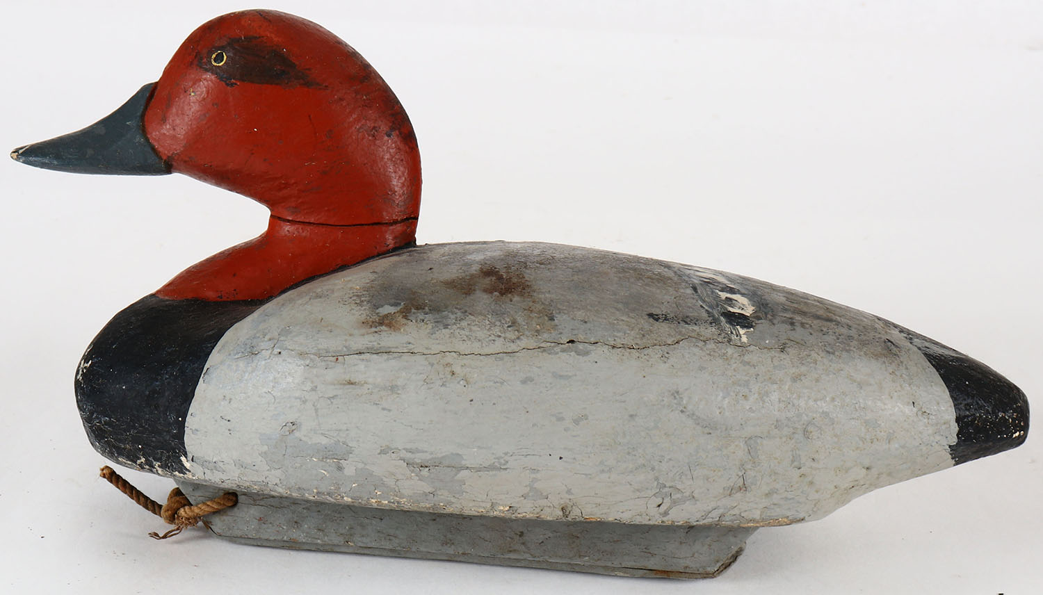 Canvasback Drake by unknown maker, PE, solid wood, original paint, has hair line crack in neck. Grade: Very Good ++ - Value: 10 to 30