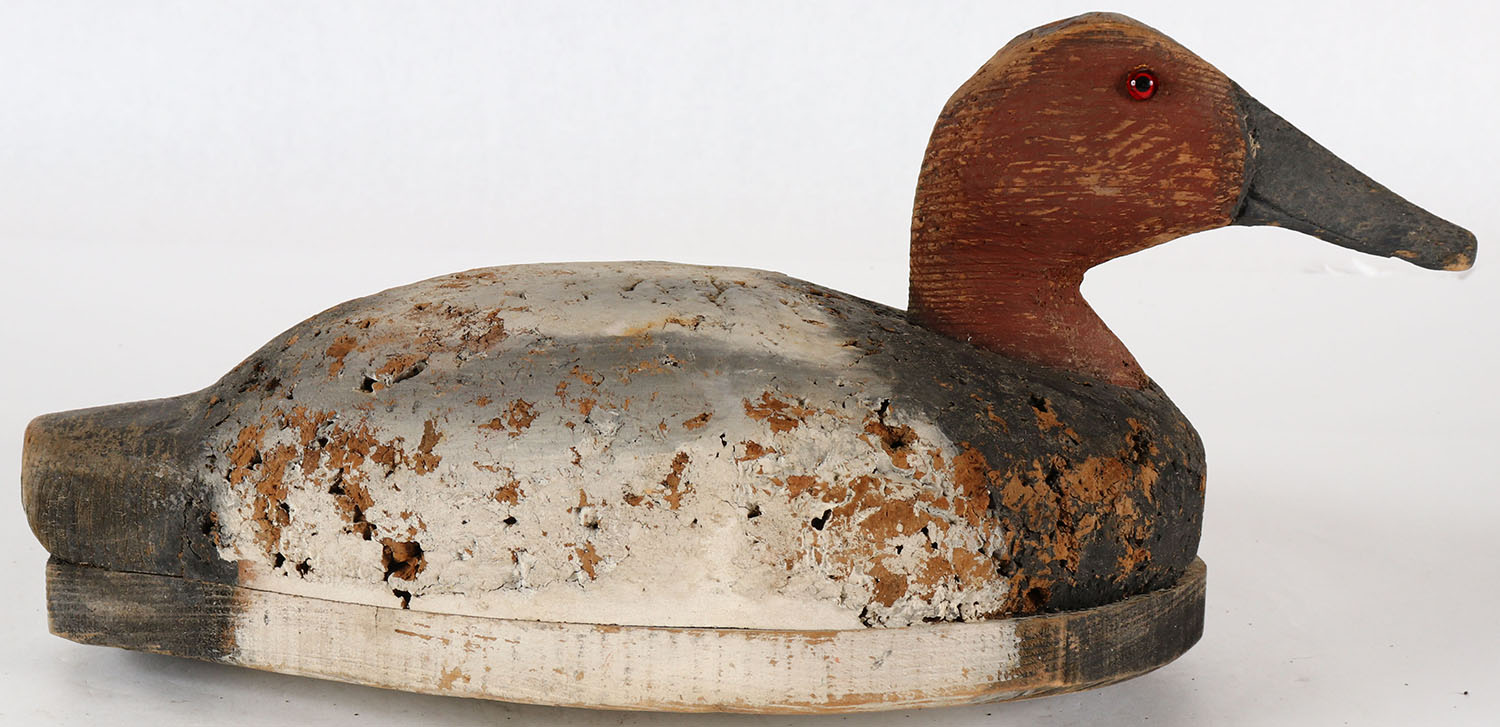 Canvasback Drake by unknown maker, glass eyes, solid cork body, wood head, original paint, structurally excellent. Grade: Very Good + - Value: 10 to 40