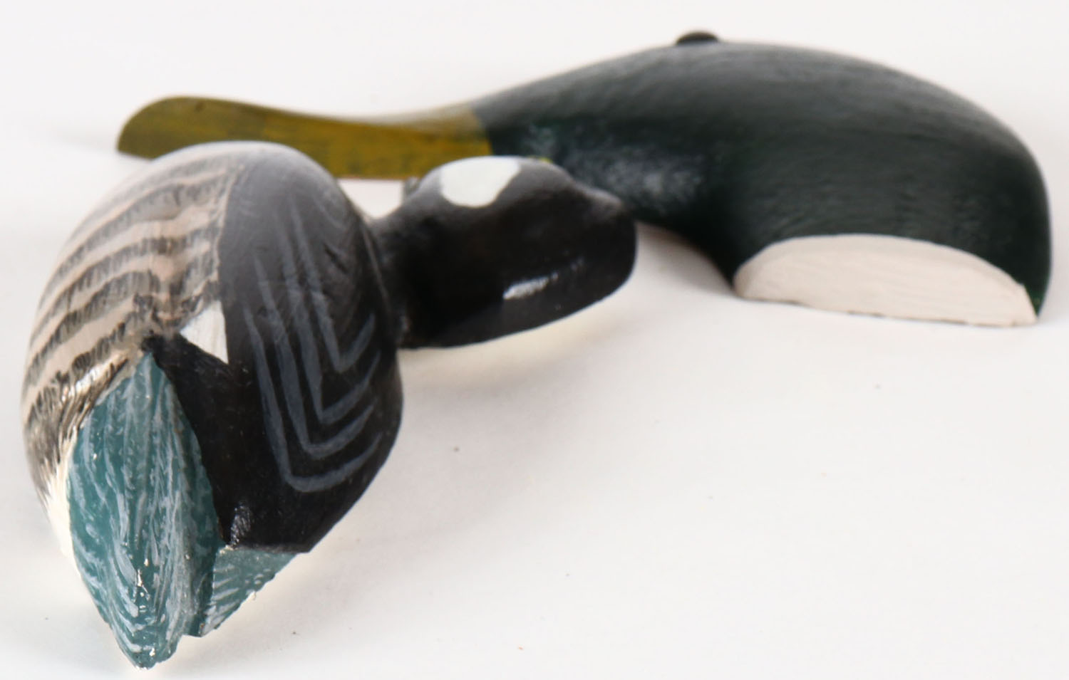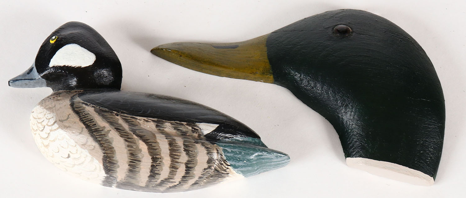 Lot of two wall handing ducks or duck heads, made of wood, both are unmarked, mallards head is 5 1/2'' OAL. Grade: Excellent - Value: 10 to 60