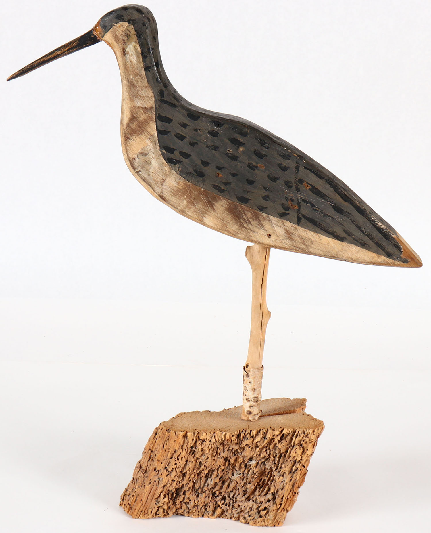 Shorebird by unknown maker, no eyes. Solid wood, original paint, on stand, 16'' tall. Grade: Excellent - Value: 20 to 40