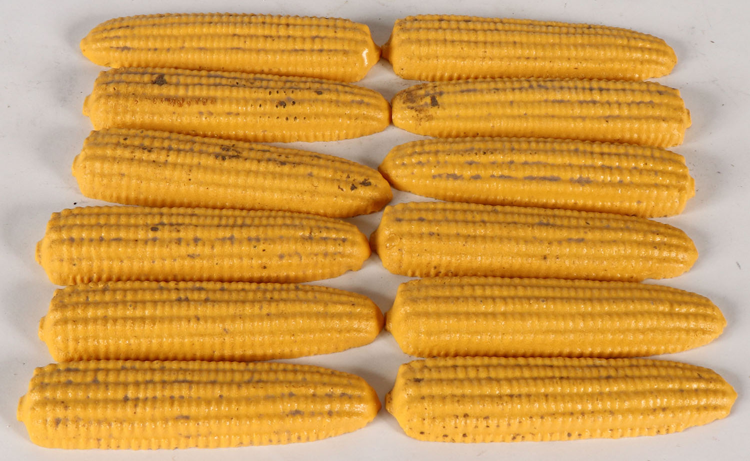 Lot of 12 Corn Cobs, all are flat on one side, made of resin, they do not float, 5'' long. Grade: Excellent ++ - Value: 6 to 30