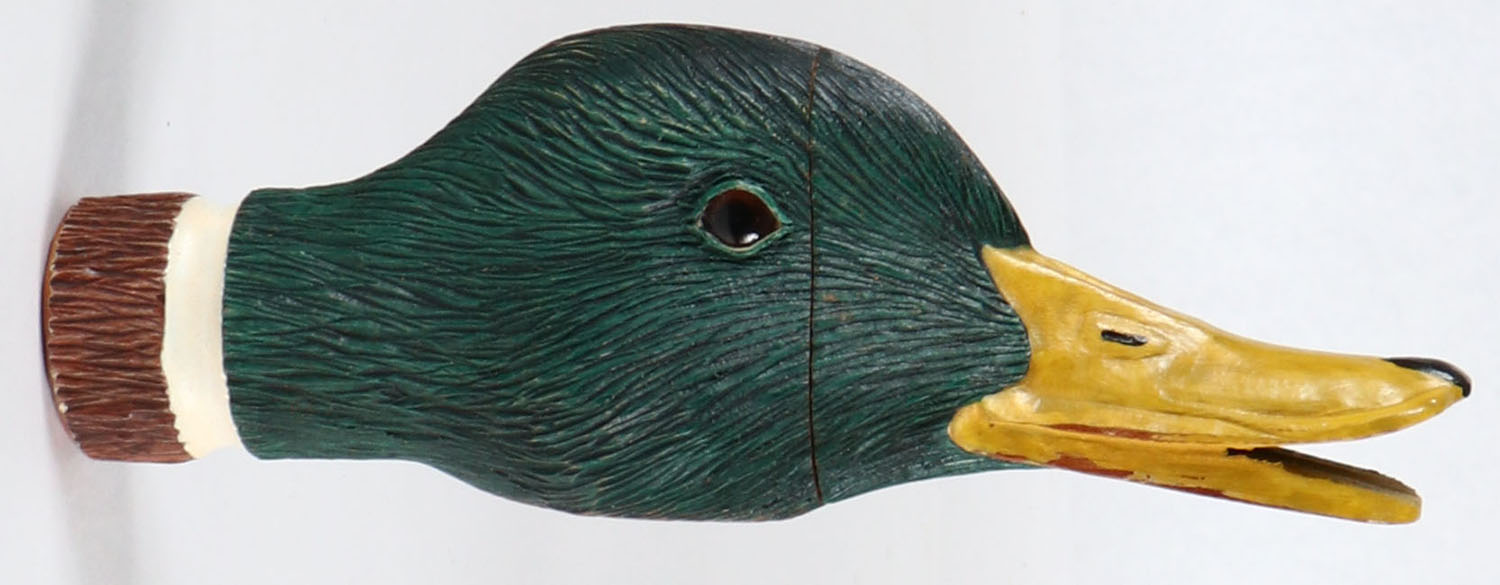 Mallard Drake head duck call, unknown maker, Glass Eyes, original paint with great feather detail, sounds great, 6'' long. Grade: MINT - Value: 30 to 150