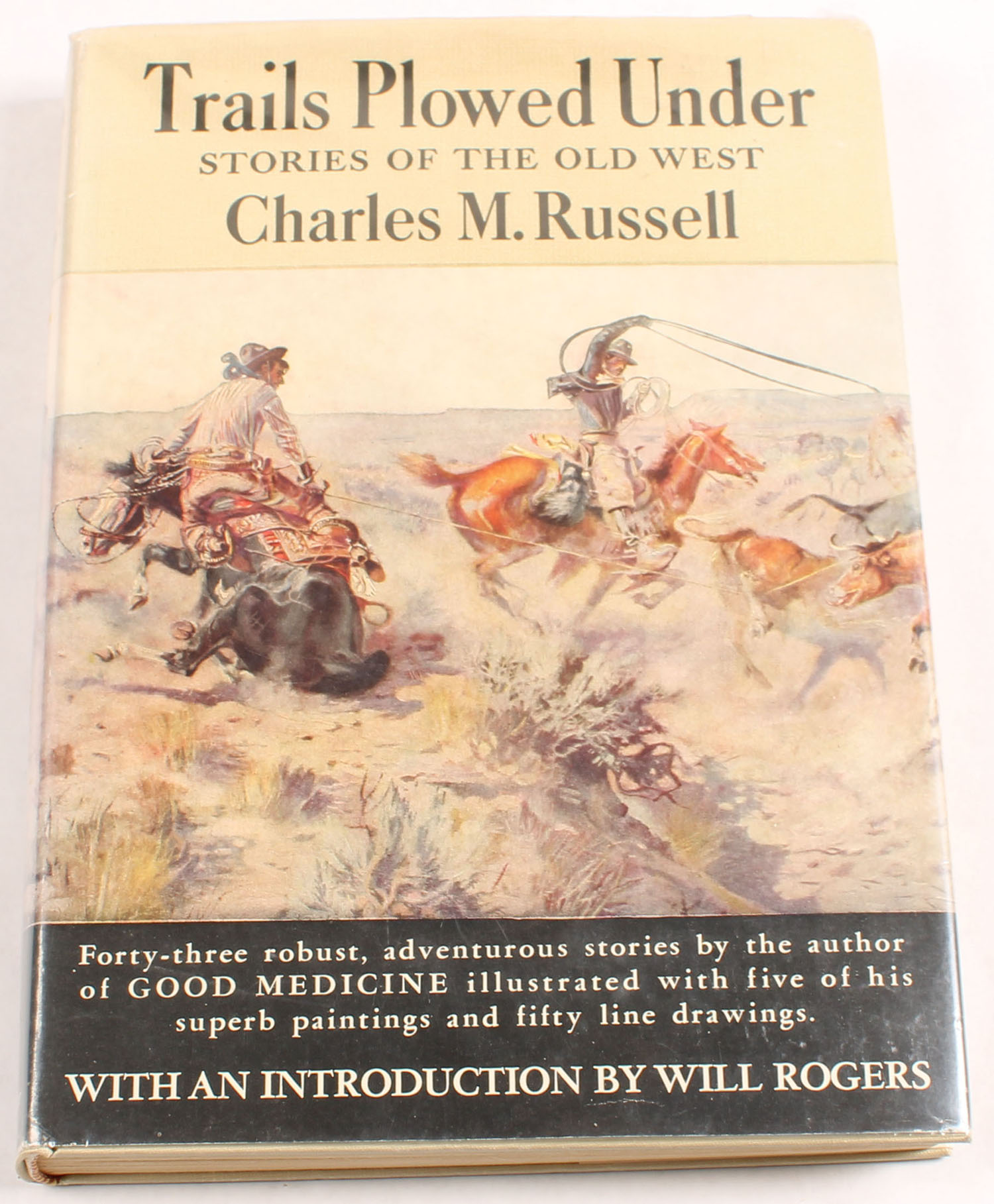 Trails Plowed Under Stories of the Old West by Charles M Russell 1927. 7 1/2'' x 10 1/2'', 210 pages, b/w photos, pages clean, binding tight, hardcover excellent, paper dustcover very good. Value $100 Grade: Very Good ++ - Value: 10 to 100