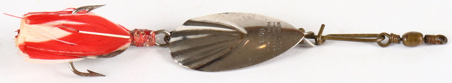 Winchester Fluted Trolling spoon No 9613, Nickel & red blade with feather teaser, 1 hook. Grade: Excellent - Value: 2 to 100