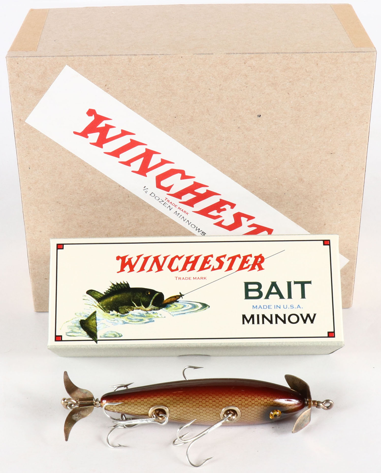 Near Full Case of (2001) Winchester 5 hook lures, has 5 marked 2001 red scale, (1) marked 2003 white & black polka dots, most are sealed boxes. Grade: MINT - Value: 100 to 500