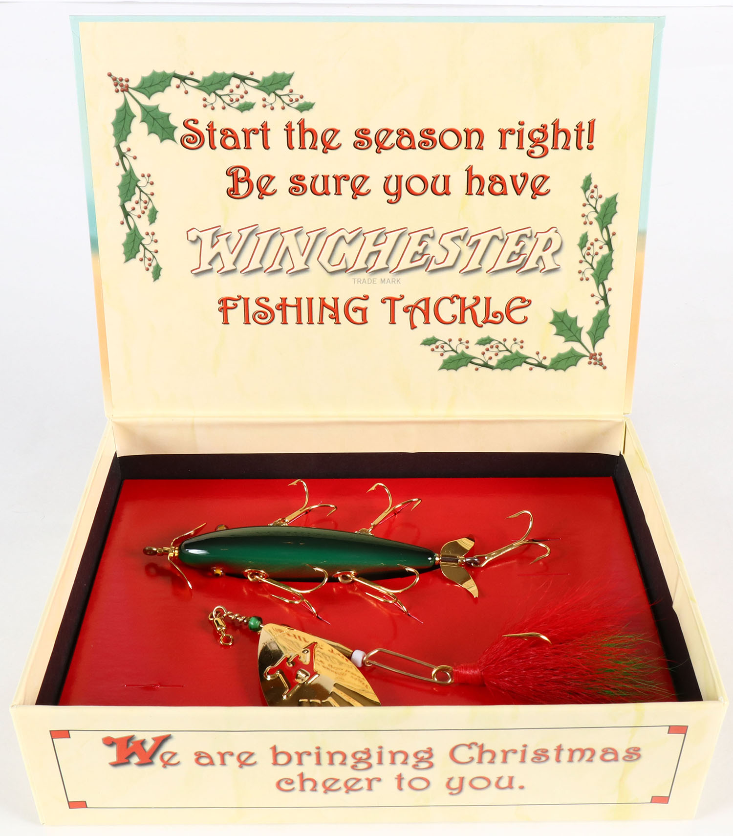 Winchester 2001 Presentation Baits, Christmas Fishing Tackle display box with a 5 hook lure & a spinner, box is 9'' wide. Grade: MINT - Value: 50 to 200