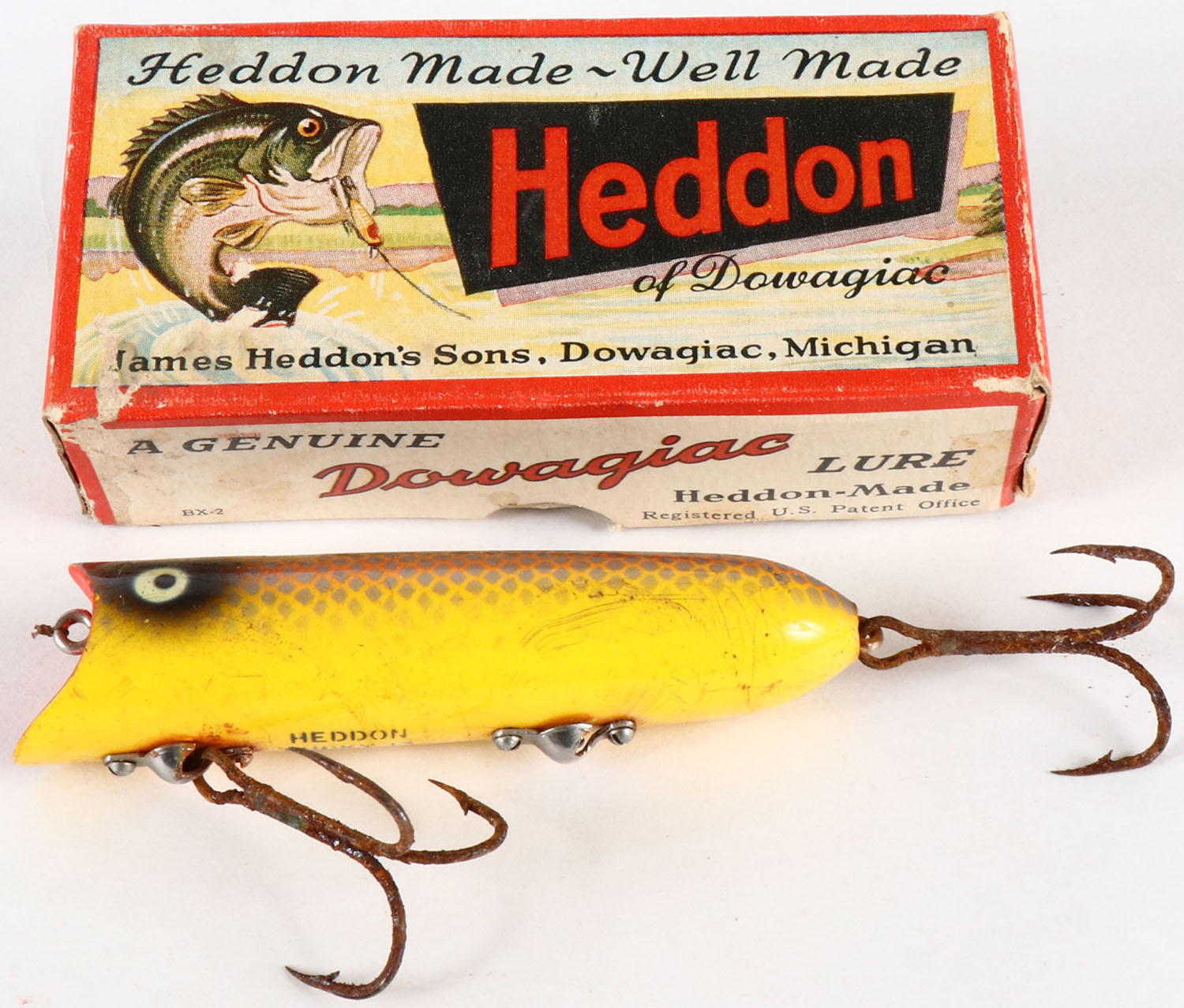 Heddon Lucky 13 n the original box, wood lure, PE, yellow/silver Scale, 3 hooks, marked belly, surface rig, 3 3/4''. Grade: Excellent - Value: 10 to 50