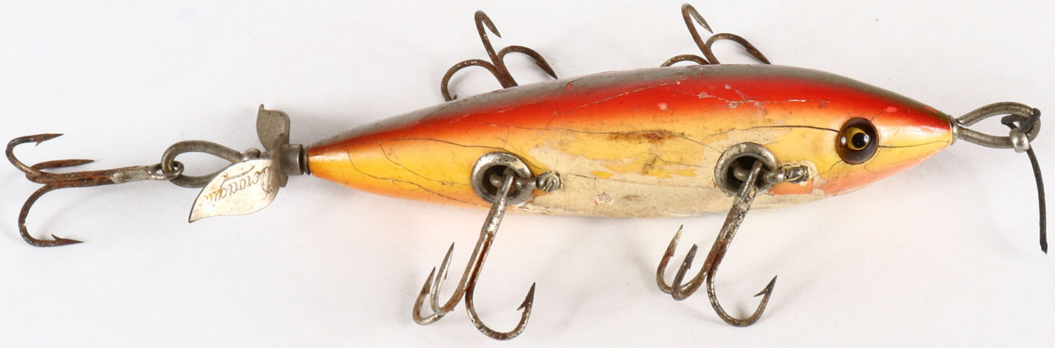 Heddon 150 DOWAGIAC MINNOW, 5 hook lure, Rainbow finish, has glass eyes, missing front prop, shows paint chips trough out. Grade: Good ++ - Value: 10 to 60