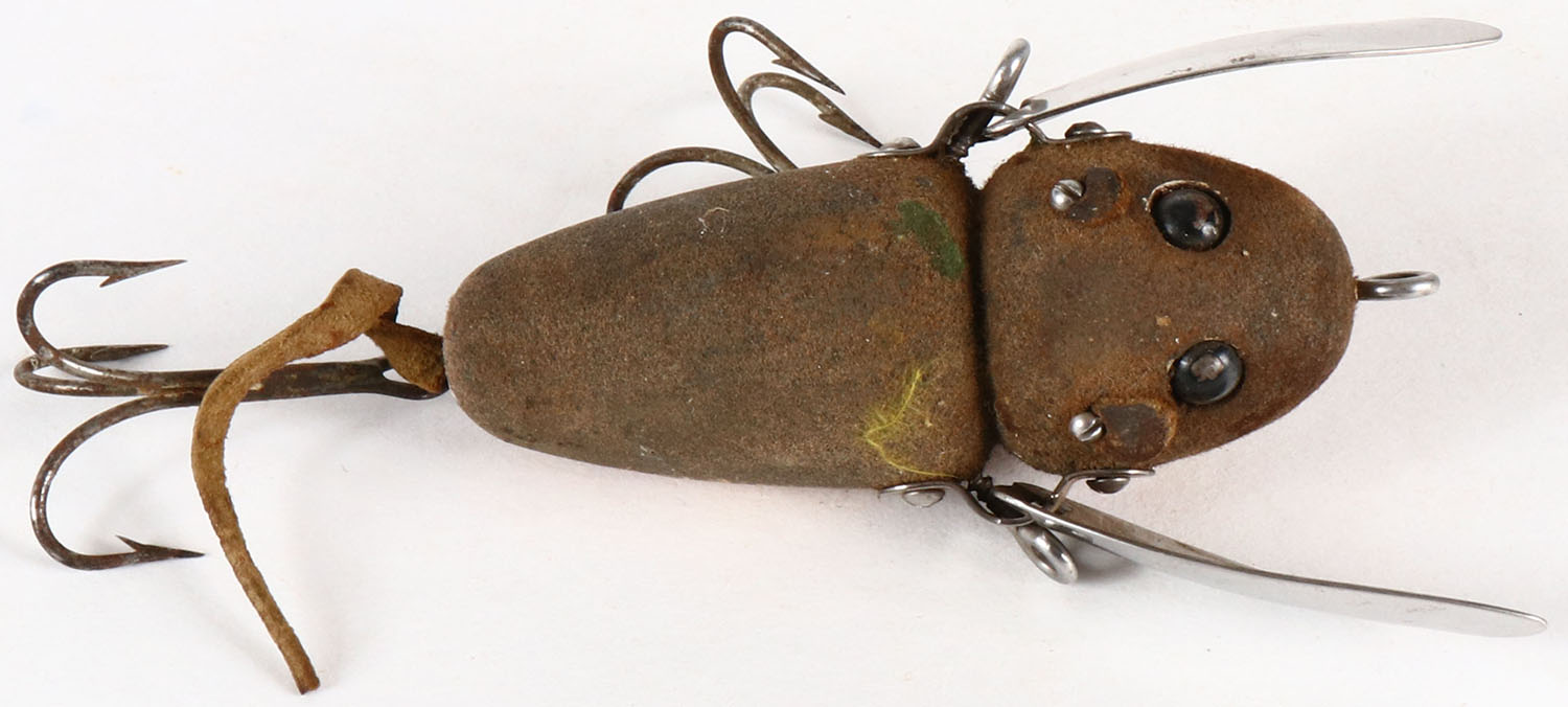 Heddon Crazy Crawler, wood lure, TE, mouse pattern, 2 hooks, surface rig, has leather ears & tail, 3''. Grade: Excellent - Value: 10 to 40