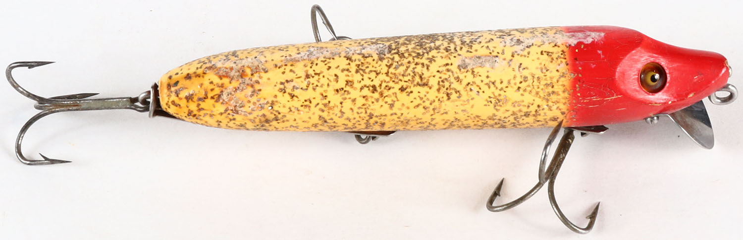 Heddon Vamp, wood lure, GE, red & white with gold fleck, 3 hooks, Surface rig, 4 3/8'', marked on belly. Grade: Excellent - Value: 10 to 40